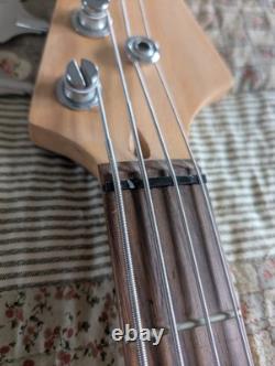 This bass guitar is handed painted by me. I was given this instrument, of unknown brand (the name appears to have been sanded off the headstock) several years ago. It was black at the time, I sanded, repainted and lacquered the front. I used to tour with a band in Surrey until 2019 and this bass is therefore well-used. Part of the nut broke off around the time I stopped playing so I haven't played it in many years.